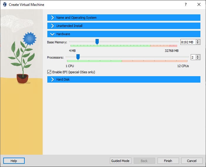 3. Then head to the Hardware section and set base memory to 4000 or more MB. And then increase the processors to 2 if you have a quad-core processor.