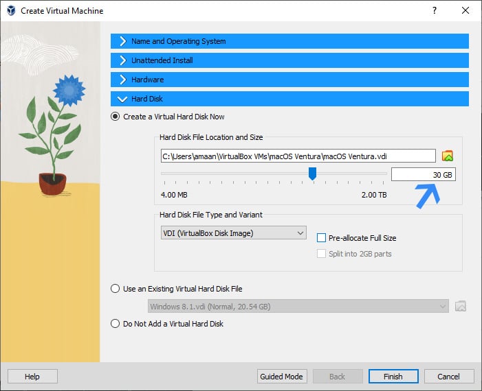 4. Now create a virtual hard disk for installing macOS Ventura on it. Keep the space at least 30 GB to ensure proper installation and then click finish.