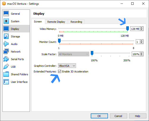 6. Head to the Display section and increase video RAM to 128 MB. Also, tick the box that says Enable 3D acceleration.