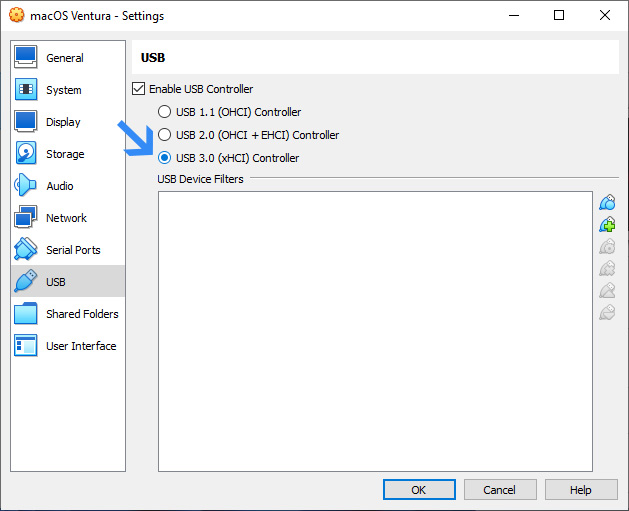 7. Now head to USB and tick USB 3.0 (xHCI controller). Then click OK to finish the final setup before installation.