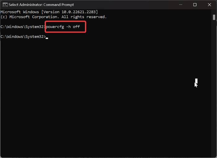- On the command prompt window, type powercfg -h off and press Enter to run the command.