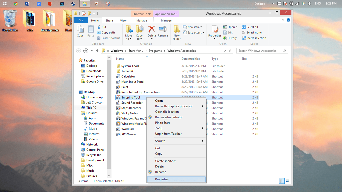 Now, locate SnippingTool and right click it, and then click,”Properties”