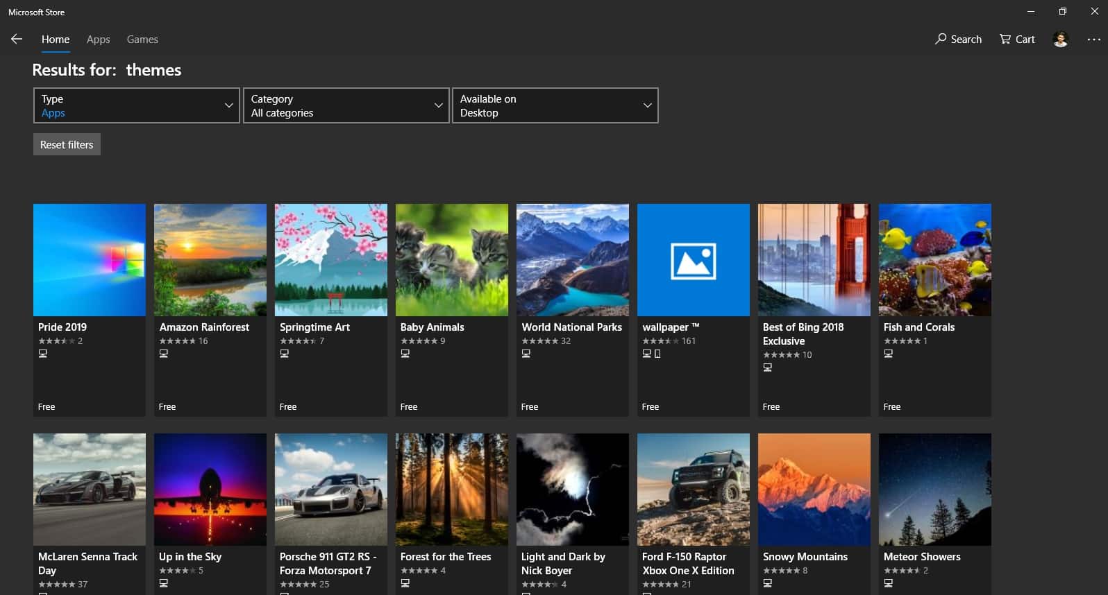 Microsoft offers a massive selection of Windows 10 themes on it’s App store. These themes generally have a good collection of wallpapers and sound effects.
