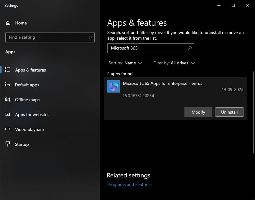 2. Search for Microsoft 365 and uninstall it through the button.