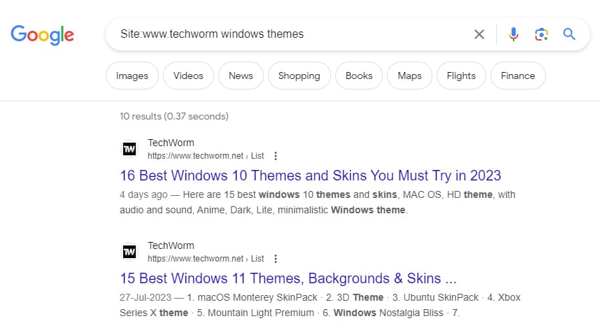 For example, if you are looking to find Windows themes related articles on Techworm, you search site:www.techworm.net Windows themes.