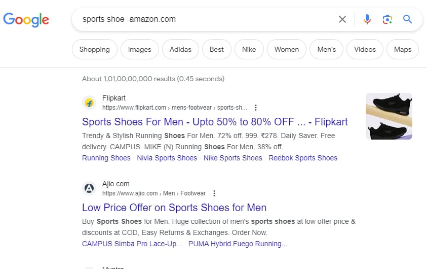 For example, when you are searching for sports shoe but don’t want to include results from Amazon.com then you will type sports shoe -Amazon.com.