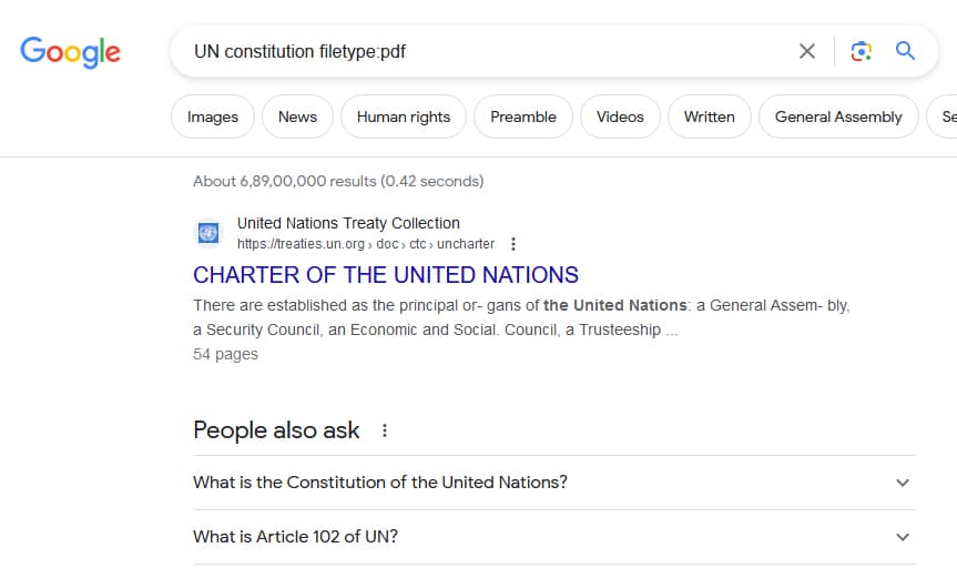 For example, if you are looking for PDFs of United Nation’s charter then you will type UN charter filetype:pdf